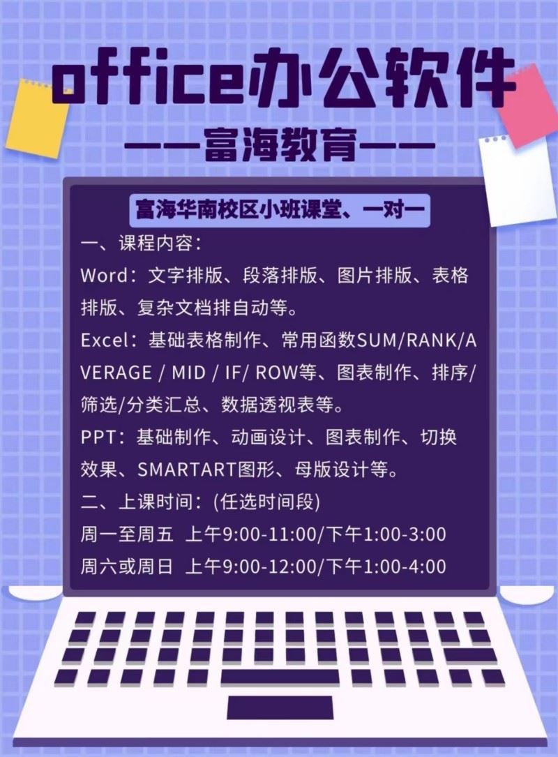 套餐名称:办公软件高级班 套餐内容: WORD文字排版、段落排版、图片排版等 EXCEL基础表格制作、常用函数、图表制作等 PPt基础制作、动画设计、SMARTART图形、图表制作等 套餐价格: 78...